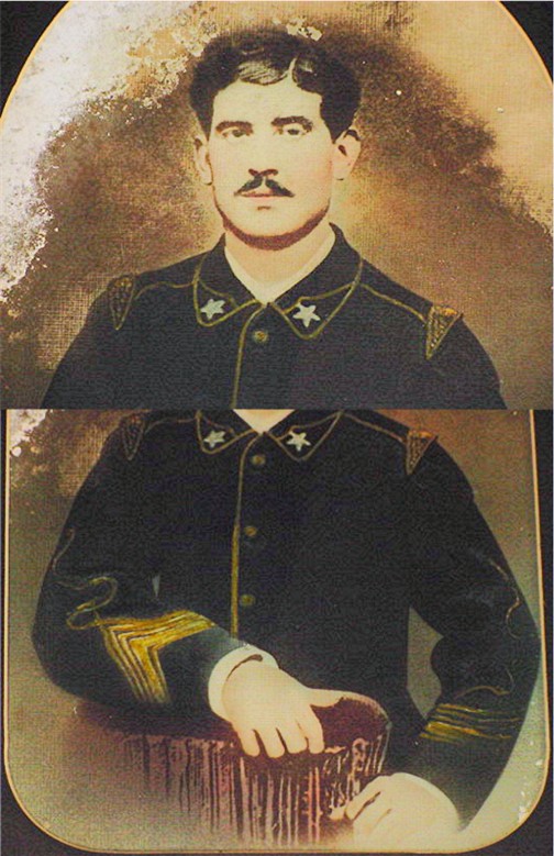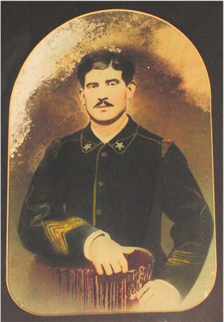 age and wearing a dark blue uniform coat trimmed with a