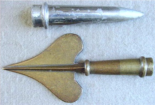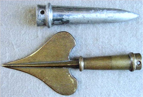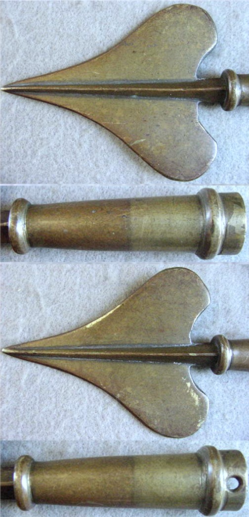 The brass spade-shaped spear tip measures 7 ¼” long and
