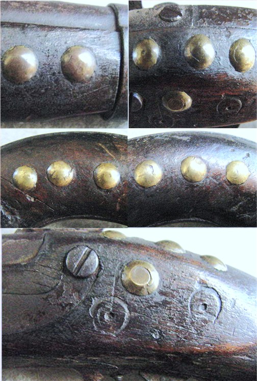 The stock is decorated with tacks distributed along the