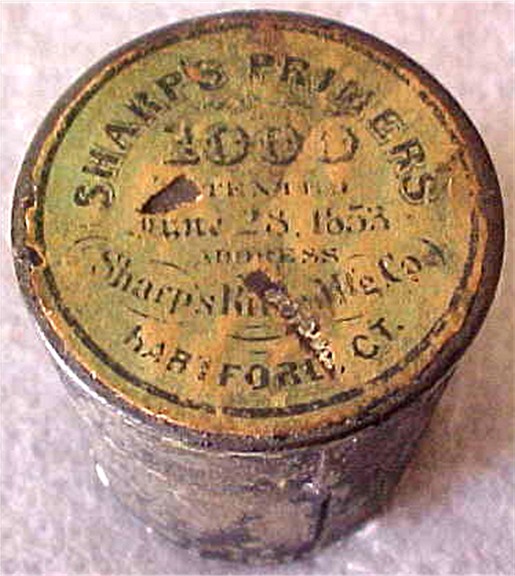 SHARPS RIFLE COMPANY LAWRENCE PRIMER TUBE TIN w/ COMPLETE LABEL & 8 FULL PRIMER TUBES – AS ISSUED FOR THE MODEL 1852 – 1863 SHARPS CARBINES SOLD